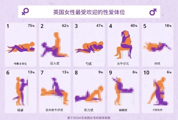 根據數據顯示:京東健康,提到女上位、后入式和傳教士式是國內女性最愛的三種體位,而日本女性更喜歡嘗試不同體位,如側臥式、后入式,但未明確最偏好的體位。英國女性中 36% 偏好傳教士式,而男性中 25% 偏好狗爬式,當然不同城市偏好不同,如倫敦偏好 “鷹式”(傳教士變種)。